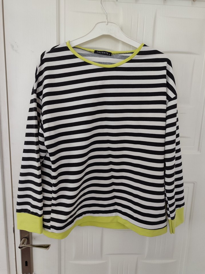 Uzun kollu, bisiklet yaka, bol kesim kadın kazak. Siyah beyaz çizgili, sarı detaylı, yumuşak sentetik kumaştan üretilmiştir.