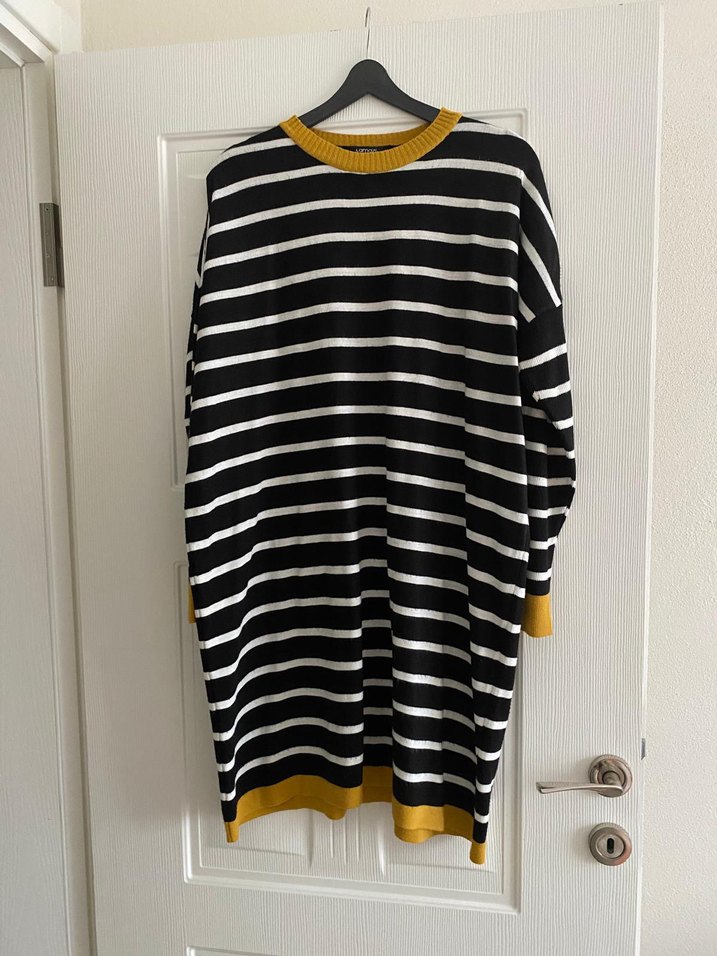 Siyah beyaz çizgili, bol kesim uzun kazak; koyu sarı ribanalı yuvarlak yaka, kol ve etek uçları ile örülmüştür. Günlük rahat kullanıma uygundur. Lamazi marka