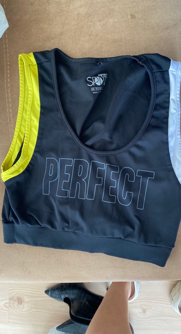 Siyah temel renk üzerinde sarı ve beyaz yan panellerle, önünde 'PERFECT' baskısı bulunan spor sütyeni. Normal uzunlukta, athleisure tarzında.