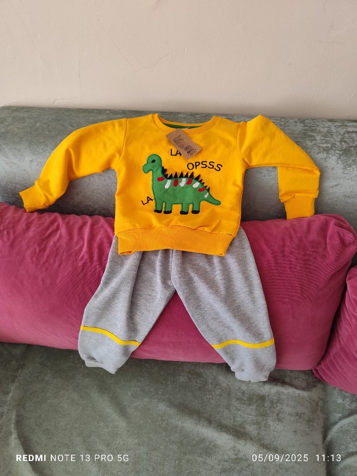 Uzun kollu, sarı dinozor desenli ve örgü detaylı bebek üstü, gri pantolonla takım. Yumuşak ve sıcak kumaştan, bisiklet yaka, sokak stili için uygun. 1-2 yaş uyumlu.