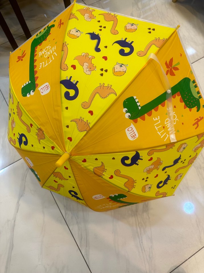 Canlı sarı renkli, dinozor ve yaprak desenli kadın şemsiye, eğlenceli fırfır detaylarıyla sokak stiline uygun…