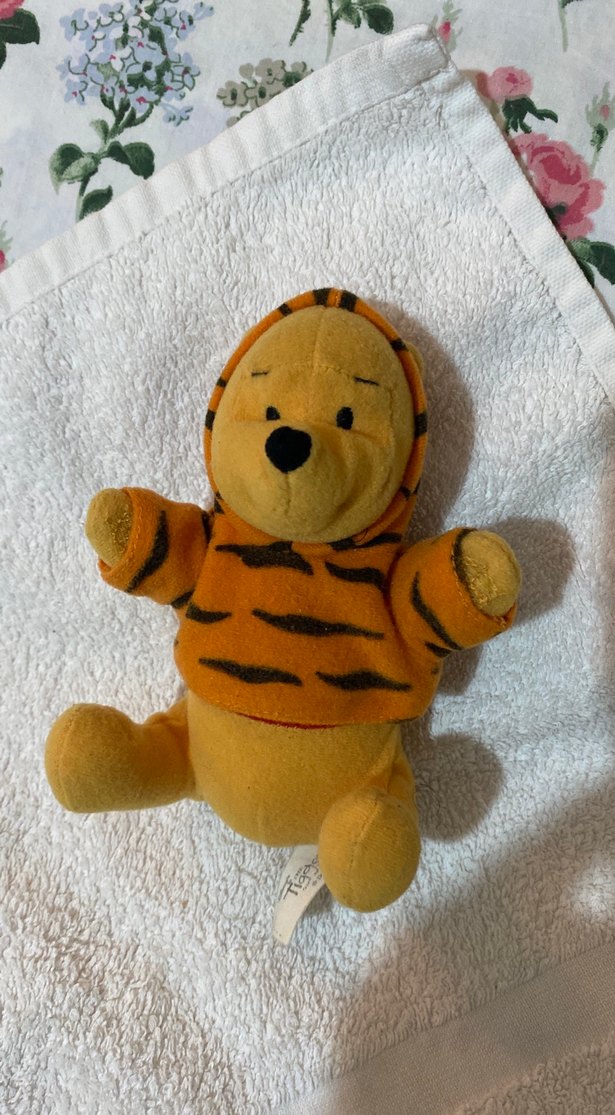 Renkli kapüşonlu kaplan desenli sarı peluş oyuncak, yumuşak ve sevimli bir görünüme sahip.