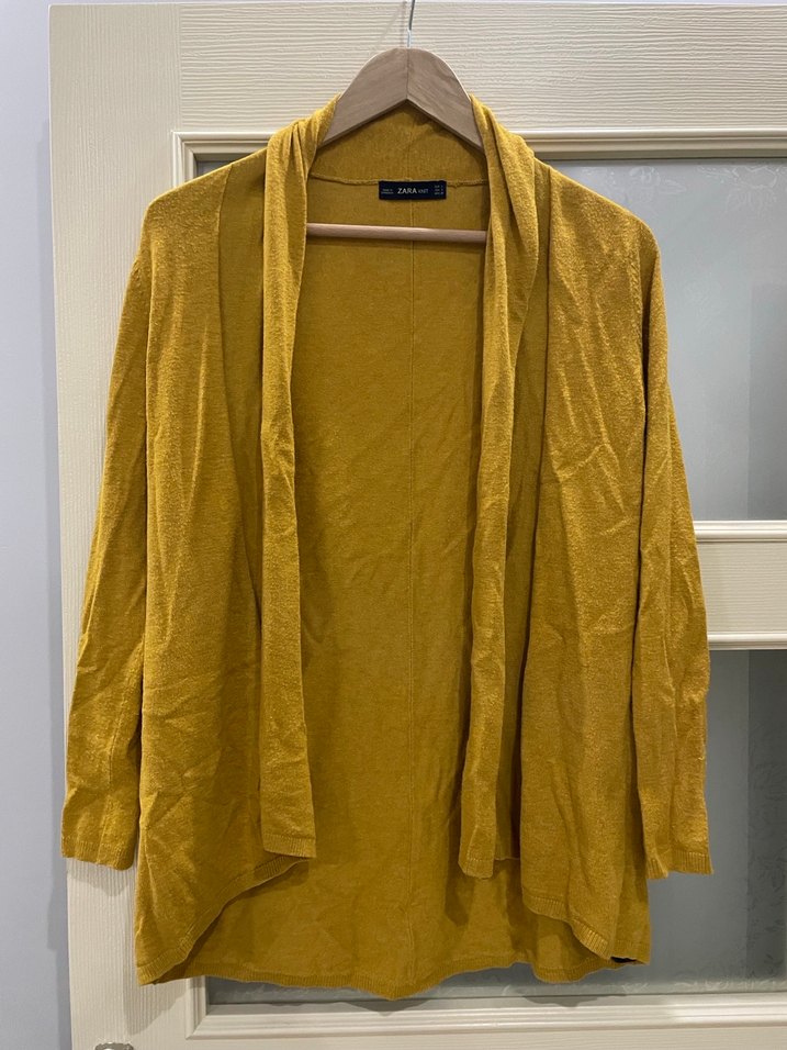 Sarı keten kumaştan, dökümlü uzun kollu, notalı yaka detaylı, bol kesim kadın hırka. Parlak ve desensiz, rahat bohem tarzda günlük kullanım için uygun.