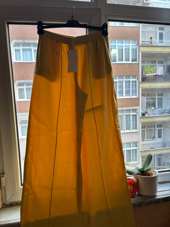 Yumuşak keten kumaştan, dökümlü tasarımlı, rahat lastikli bel bandına sahip, parlak sarı midi boy bol kesim kadın pantolonu.