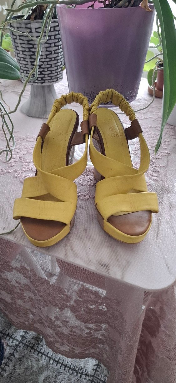 Sarı dolgu topuklu sandaletler, tokalı bantlara sahip, yumuşak kauçuk malzemeden üretilmiştir. Minimalist ve bohem tarz, günlük kullanım için uygundur.