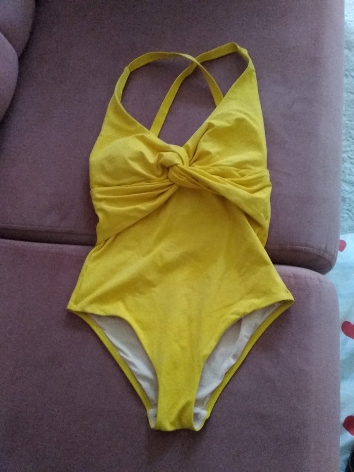 Sarı, ince askılı, drapeli detaylı, vücuda oturan mayo, sade ve bohem tarzda plaj için uygun. ️