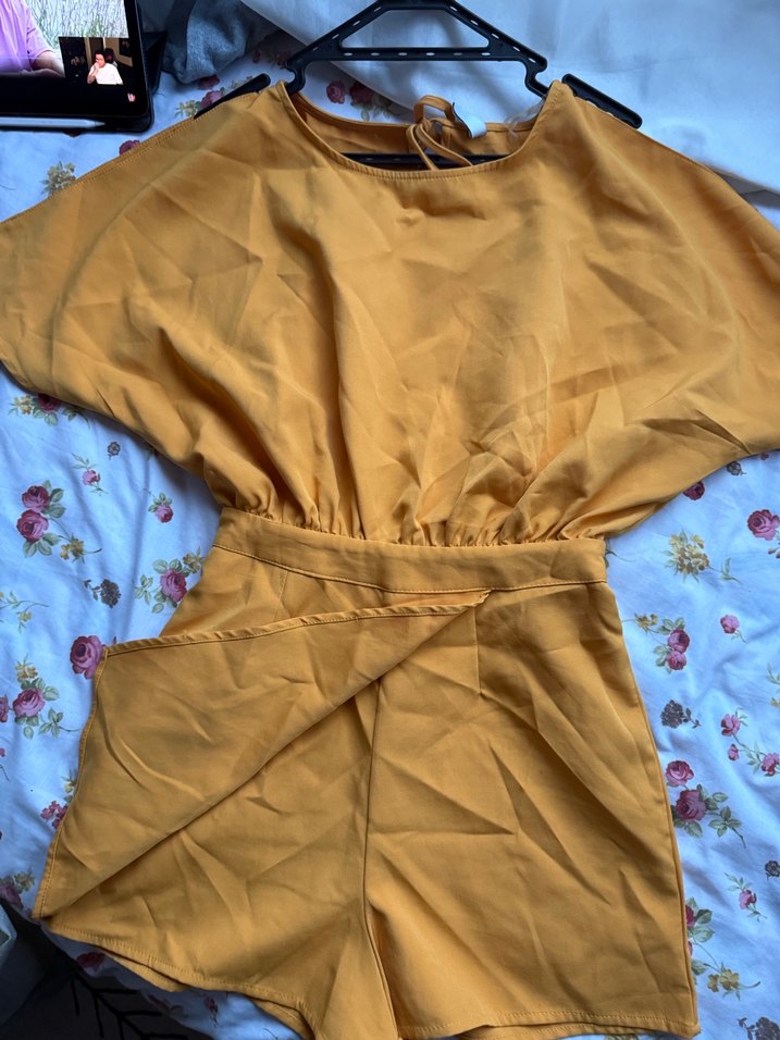 Sarı renkli, drapeli ve kısa kollu kadın midi tulumu. Askısız yakası ve bol kesimiyle bohem tarzda, parlak sentetik kumaştan üretilmiştir. Lekeleri vardır görsellerde mevcut