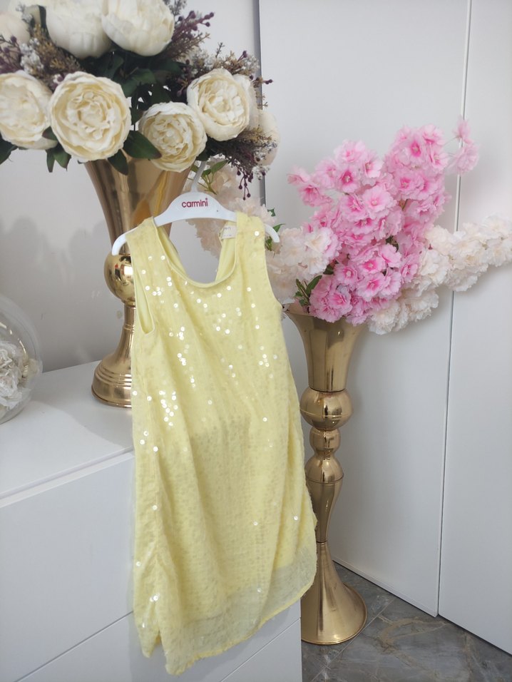 Sarı, kolsuz ve drapeli bu elbise, bol kesim ve yuvarlak yakaya sahiptir. İpeksi kumaştan yapılmış, pastel payet baskılı deseniyle bohem ışıltılı tarzını yansıtır.fiyat sadece elbise için gecerlidir. iade yoktur.