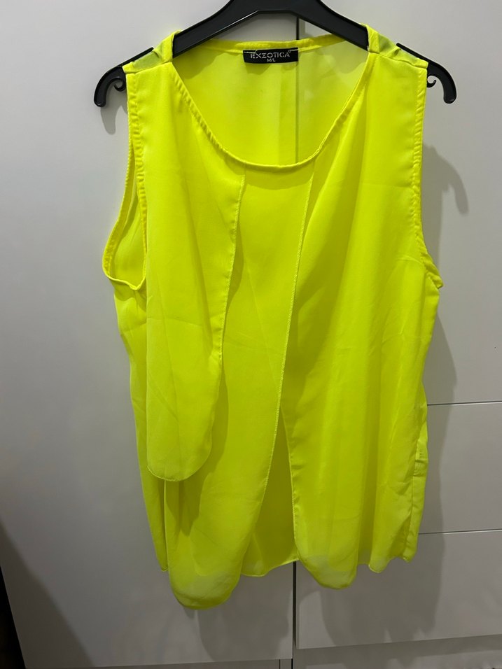 Sarı, parlak sentetik kumaştan yapılmış, drapeli ve kolsuz yüksek yakalı, bol kesim midi uzunluğunda bluz. Desensiz ve sokak modasına uygun avant-garde tarzda.