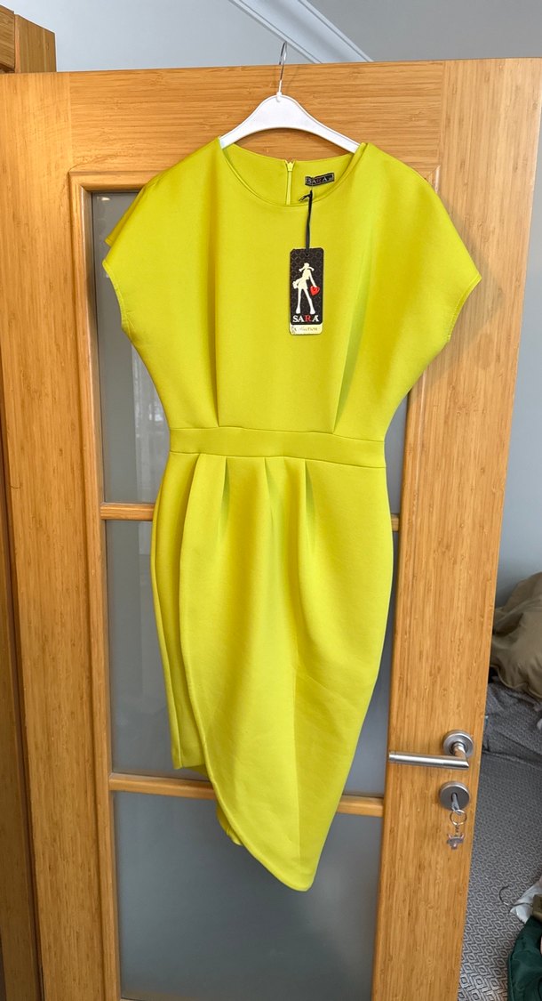 Scuba kumaş.etiketli.Drapeli detaylı, bisiklet yaka, kolsuz, sarı midi kalem elbise. Ofis şıklığı için uygun, yumuşak sentetik kumaştan yapılmıştır.