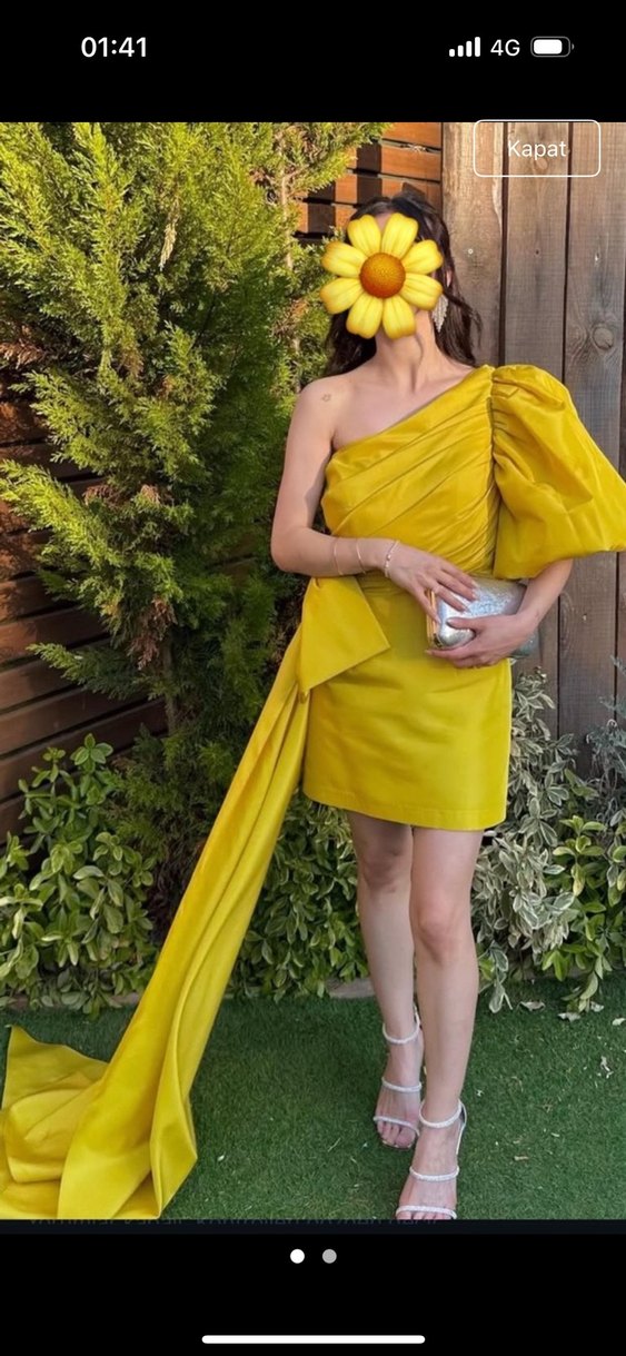 Alfabeta markalı Sarı, drapeli mini elbise. Tek omuzda kabarık kol ve uzun kuyruk detayı ile şık, parlak tafta kumaştan yapılmıştır. Kuru temizlemi yapılmıştır . Hem kurdele hem kuyruk kısmı çıt çıtlıdır kolay çıkabilir boy 160 kilo 50