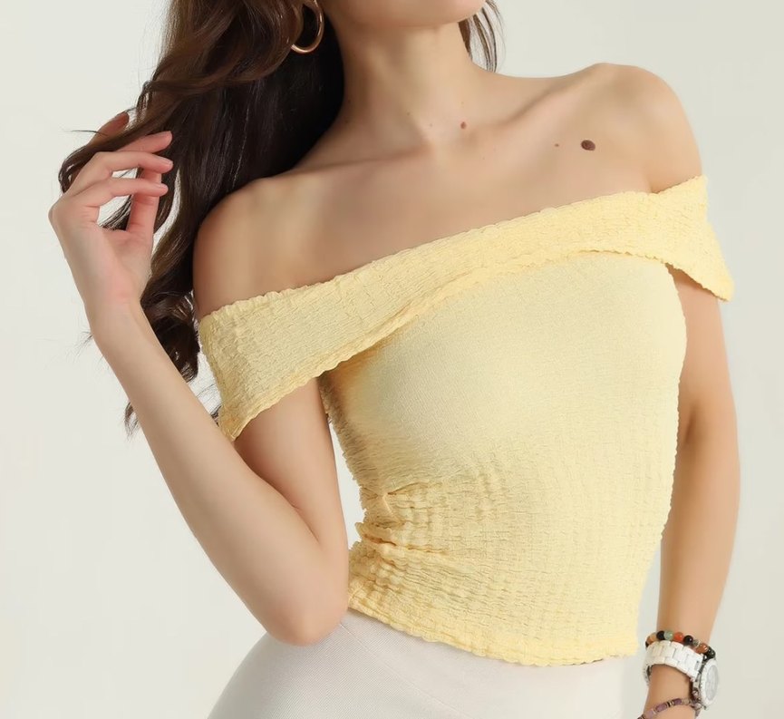 Yumuşak sentetik kumaştan, drapeli tasarıma sahip sarı straplez ve kolsuz, vücuda oturan midi boy bluz. Minimalist ve cesur stil için uygun.