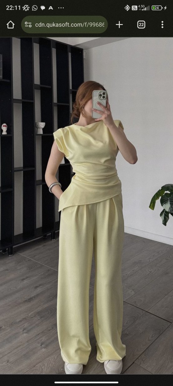 Sarı, drapeli, straplez midi tulum. Yumuşak keten kumaştan, kolsuz ve desen içermeyen minimalist tarzda, ofis için uygun. çok fazla giymedim tarzıma uymuyor