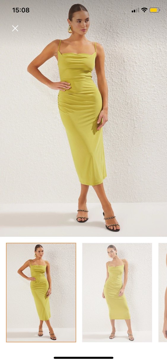 Bu sarı, straplez uzun elbise, drapeli ve vücuda oturan kesimiyle dikkat çeker. Yumuşak sentetik kumaştan üretilmiş, romantik akşamlar için minimalist ve şık bir tercihtir.