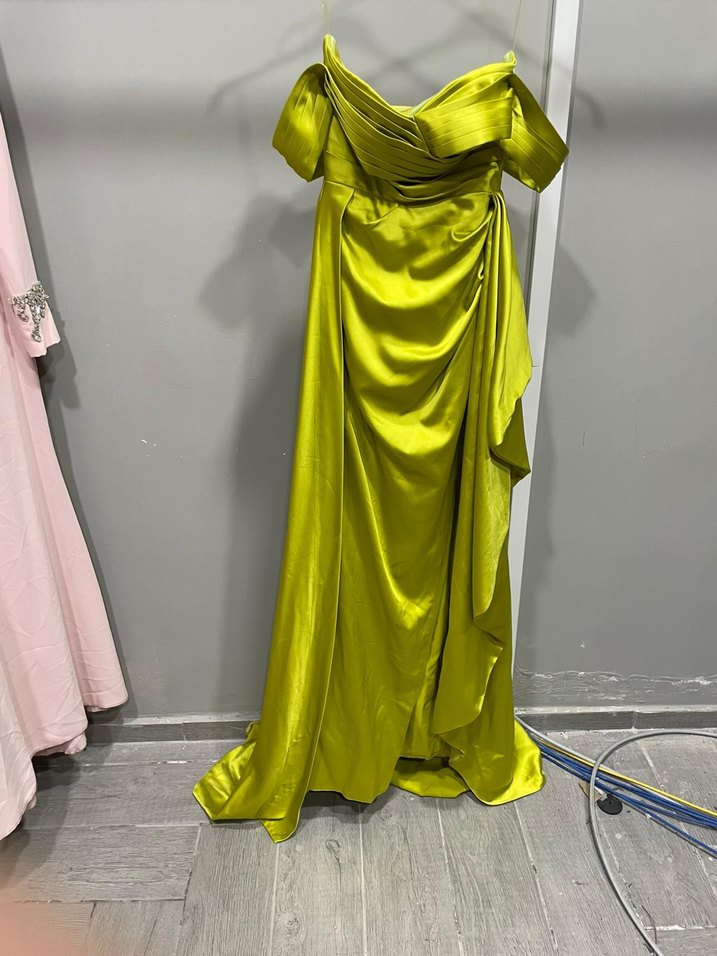 Sarı, straplez, drapeli ve parlak kumaştan uzun abiye elbise. Modern klasik tarzda, vücuda oturan kesimi ve desensiz yapısıyla düğünler için uygun.