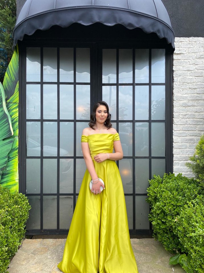 Sarı-yeşil drapeli uzun abiye elbise, straplez yakalı ve regular fit kesimlidir. Kolsuz ve desensiz yapısıyla düğün için uygundur, çağdaş ve klasik bir şıklık sunar.