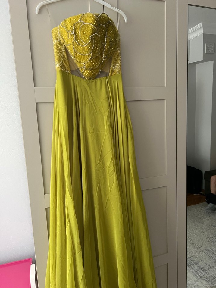 Sarı, straplez, drapeli ve parlak kumaşlı uzun abiye elbise, düğünler için uygun, vücuda oturan kesime sahiptir.