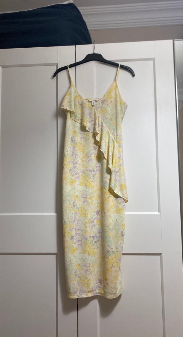 Askılı, uzun ve drapeli bu elbise, straplez yakalı ve bol kesimdir. Yumuşak sentetik kumaştan yapılmış, pastel sarı batik desenlidir, bohem tarzındadır.