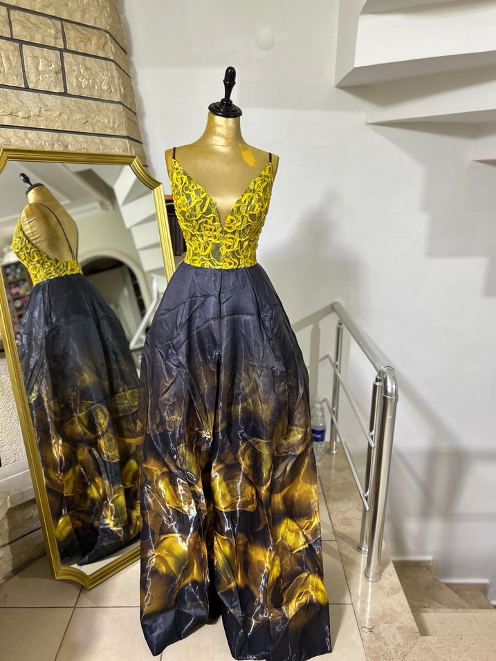 Sırt dekolteli, kolsuz, drapeli tasarıma sahip kadın abiye. Koyu sarı tie-dye deseni ve bohem tarzıyla düğünler için uygun. 34-36-38 bedenler için uygundur.