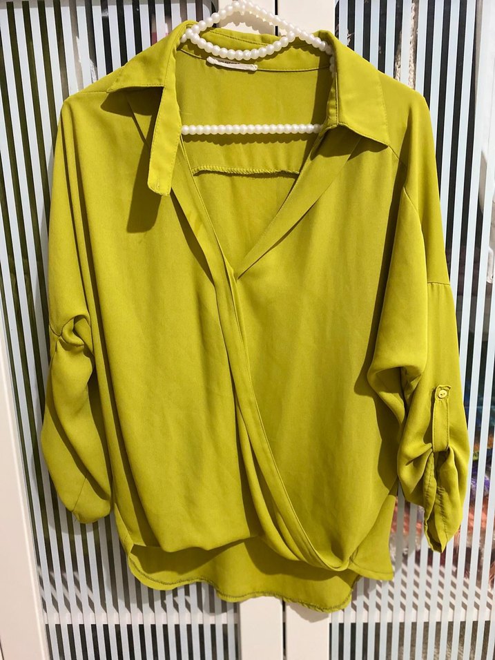 Sarı renkli kadın gömlek, drapeli ön, V yaka ve uzun kolludur. Rahat kesim ve midi boyda, yumuşak sentetik kumaştan üretilmiştir.