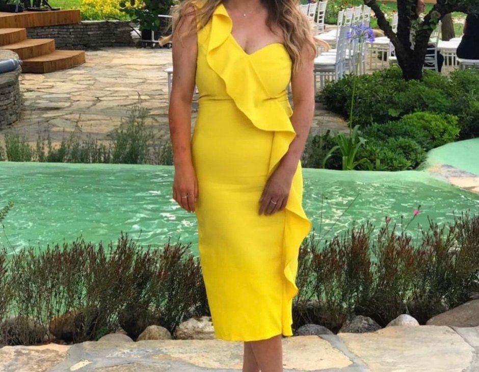 Sarı renkli, drapeli ve V yaka uzun kalem elbise.