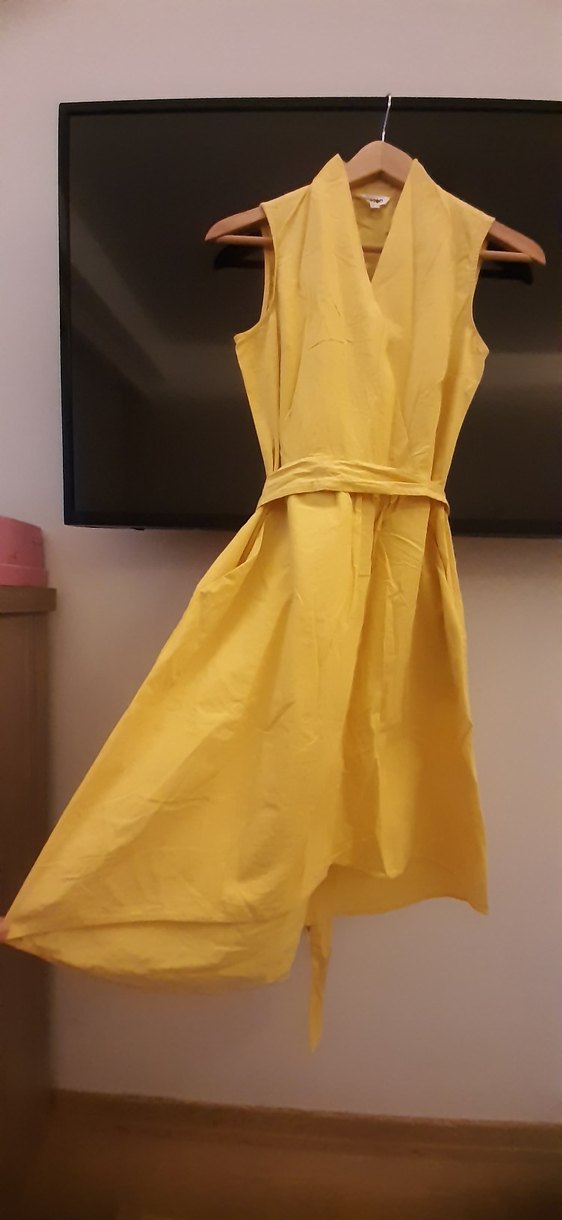 Sarı Drapeli V Yakalı Midi elbise