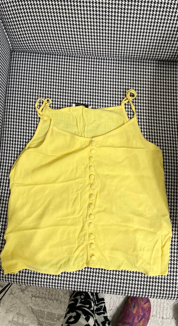 Sarı renkte, düğmeli ve askılı, sentetik kumaştan yapılmış, rahat kesim kadın atlet. Günlük kullanıma uygundur.