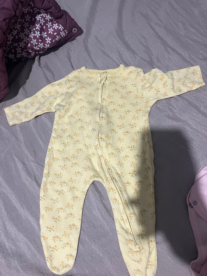 Pastel sarı, düğmeli bebek kız tulumu, yumuşak kumaş ve hafif çiçek deseniyle. Konforlu ve kolay giyilir.