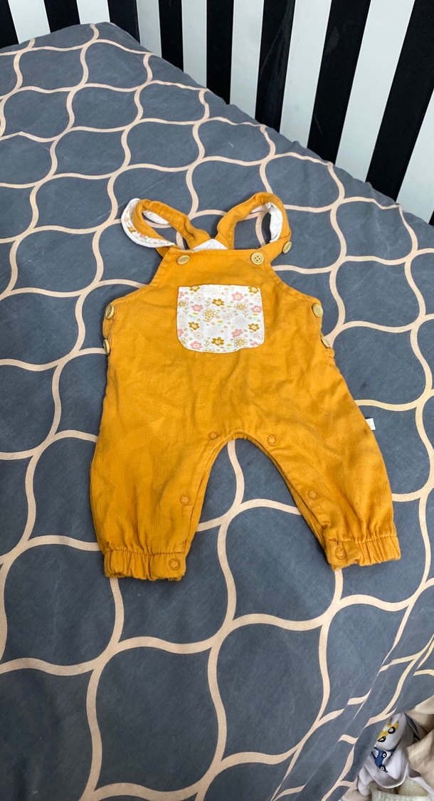 Rahat kesim, sarı renkli, kolsuz bebek tulumu. Yumuşak kumaş, önünde çiçek desenli cep ve düğme detayları bulunur.
