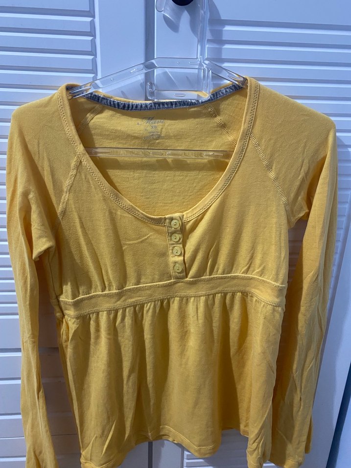 Sarı, uzun kollu bluz, düğmeli ve bol kesimdir. Yumuşak keten kumaştan yapılmış, günlük kullanıma uygundur.