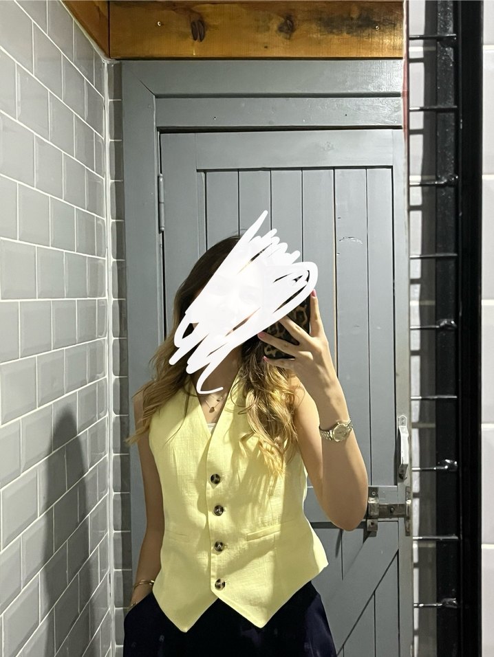 Sarı butter yellow yelek, düğmeli ve kolsuz, notched lapel yakalı, sentetik kumaştan yapılmış, vücuda oturan midi uzunlukta kadın yelek. Ofis ve günlük kullanıma uygun.
