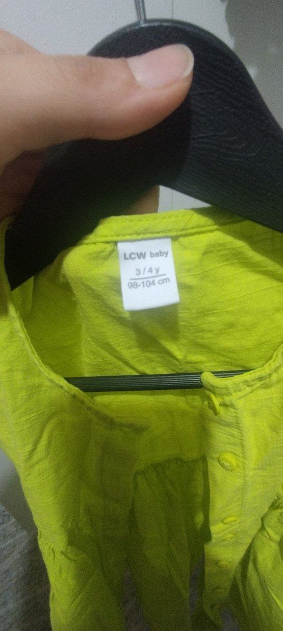 Hafif sarı keten kumaştan, kolsuz, düğmeli ve yuvarlak yakalı elbise. Günlük rahat kullanım için uygundur. 3-4 yaş