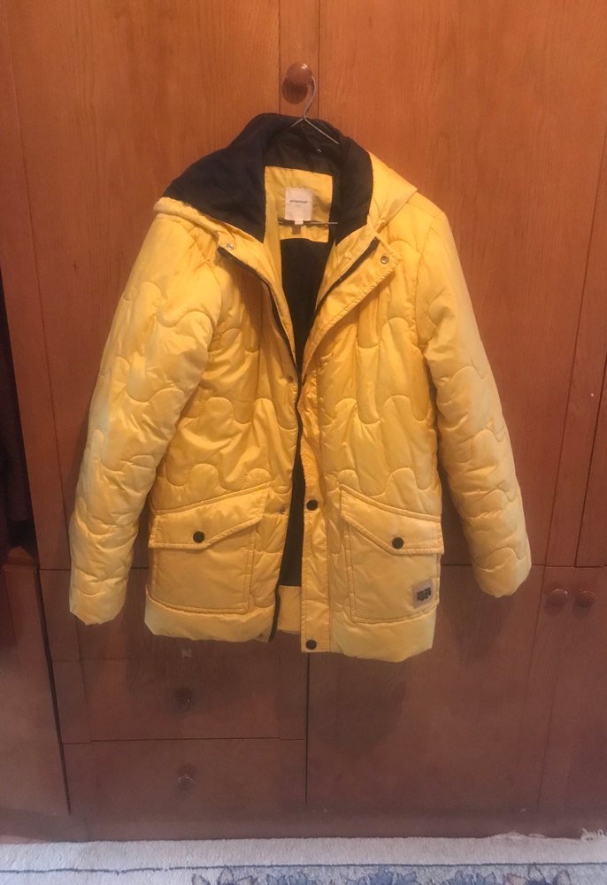 Sarı renkli, düğmeli erkek çocuk montu, kesik yakalı ve rahat kesime sahiptir. Yumuşak, sıcak tutan kumaştan yapılmıştır, parlak görünümlüdür ve iki ön cep içerir.