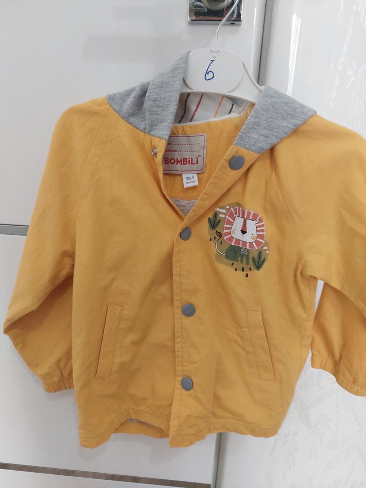 Düğmeli ve renkli baskılı aslan desenli, kapüşonlu sarı erkek çocuk yağmurluğu. BOMBiL markalı. ️