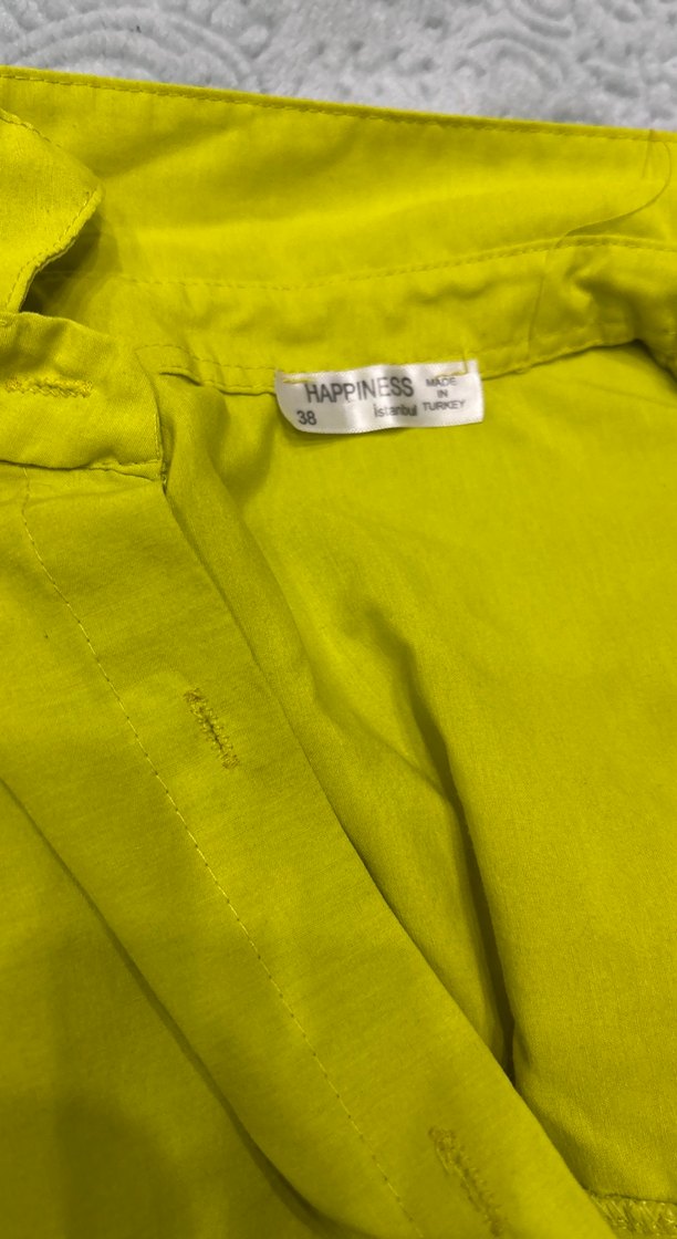 Düğmeli, uzun kollu, satenimsi kumaştan yapılmış, parlak sarı renkte, notched lapel yakalı, bol kesim hamile gömleği.