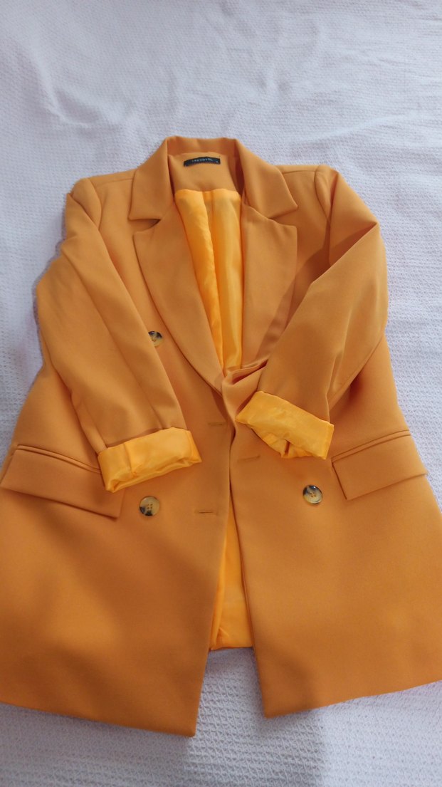 Turuncu renkli, düğmeli, notched lapel yakalı kadın blazer ceket. Uzun kollu, normal midi boyunda, parlak ve ipeksi kumaştan üretilmiştir. Ofis ve rahat sokak stiline uygundur. ✨