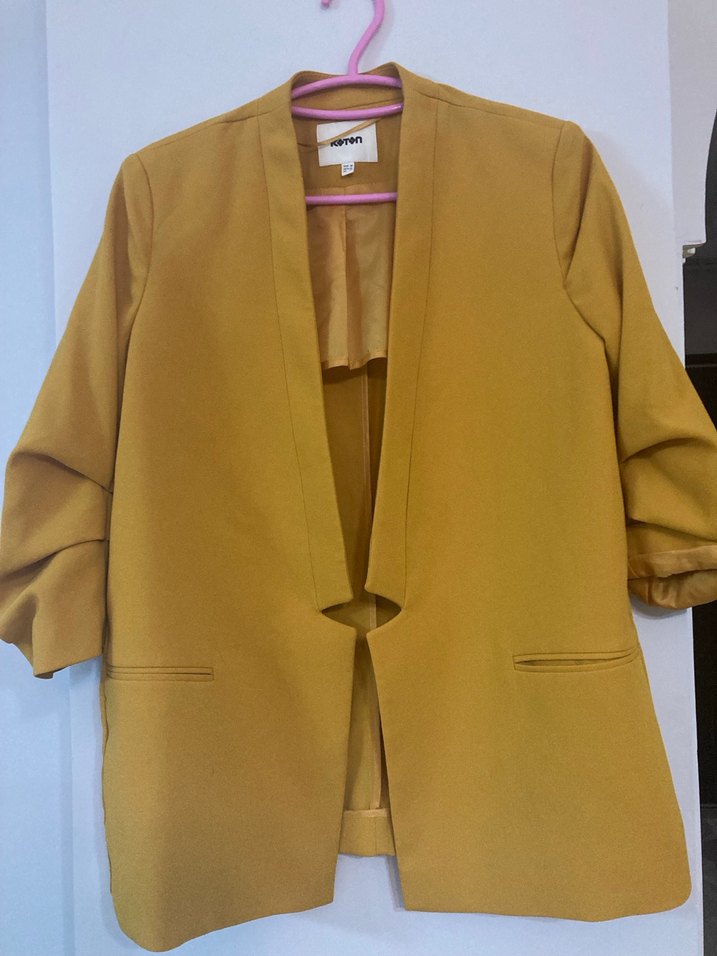 Sarı, düğmeli, uzun kollu kadın blazer ceket. Sentetik kumaştan, normal boyda ve regular fit. Ofis için uygun şık parça. ✨