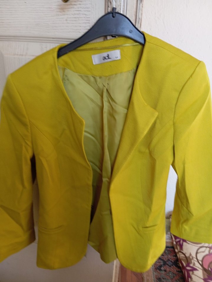 Sarı, düğmeli ve uzun kollu kadın blazer ceket. Normal boyda, regular fit ve parlak görünümlü, sokak modası ve iş stiline uygun.