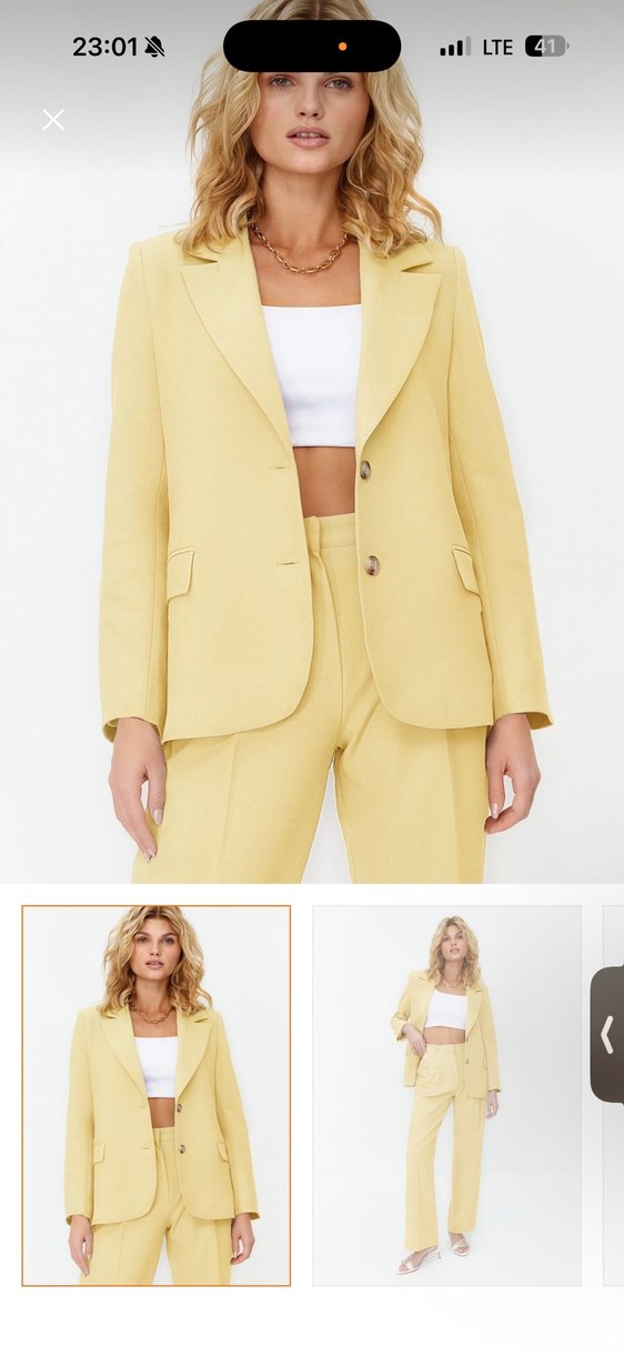 Açık sarı, düğmeli ve kesik yakalı blazer ceket. Uzun kollu, normal kesim ve ofis kullanımı için uygun. Pürüzsüz sentetik kumaştan üretilmiştir.