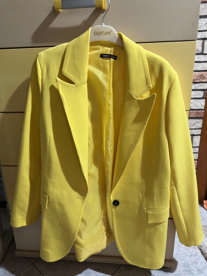 Sarı, düğmeli, normal uzunlukta kadın blazer ceket. Notch yakalı, uzun kollu ve parlak sentetik kumaştan yapılmıştır. Ofis için uygundur.