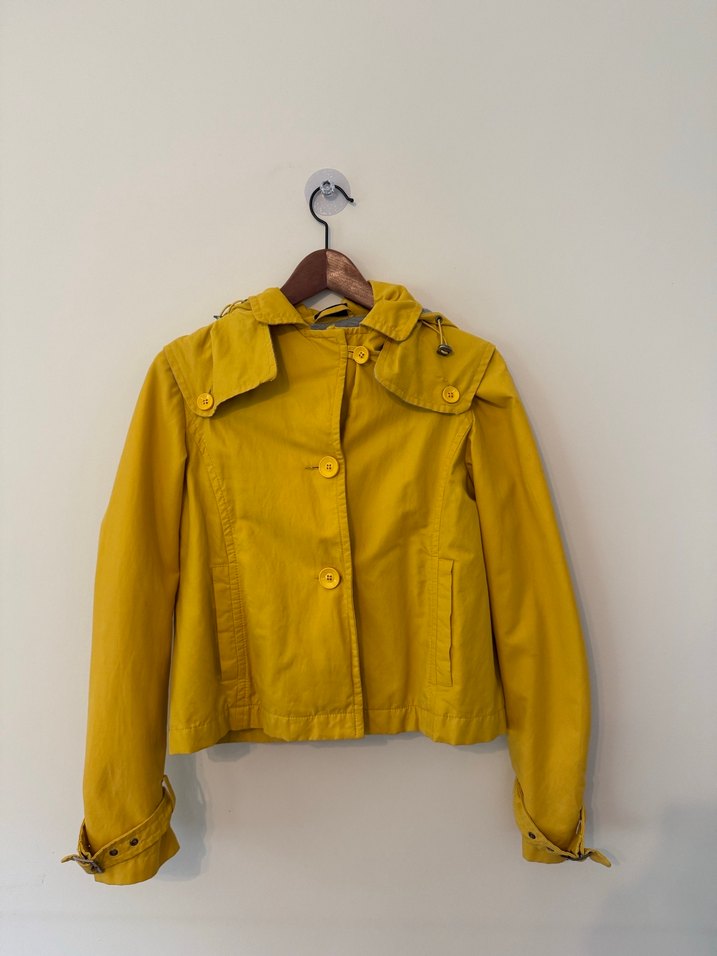 Sarı, düğmeli, uzun kollu ve yakası kesimli kadın ceketi. Rahat kesimi ve normal boyuyla dış mekan kullanımı için uygundur.