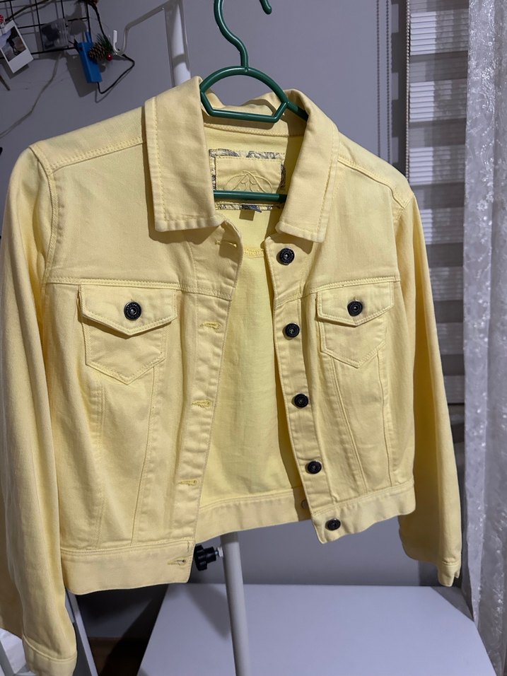 Sarı, düğmeli, pamuklu kumaştan, normal midi boyda, uzun kollu, kesimli kadın denim ceket. Günlük rahat sokak stili için uygundur.