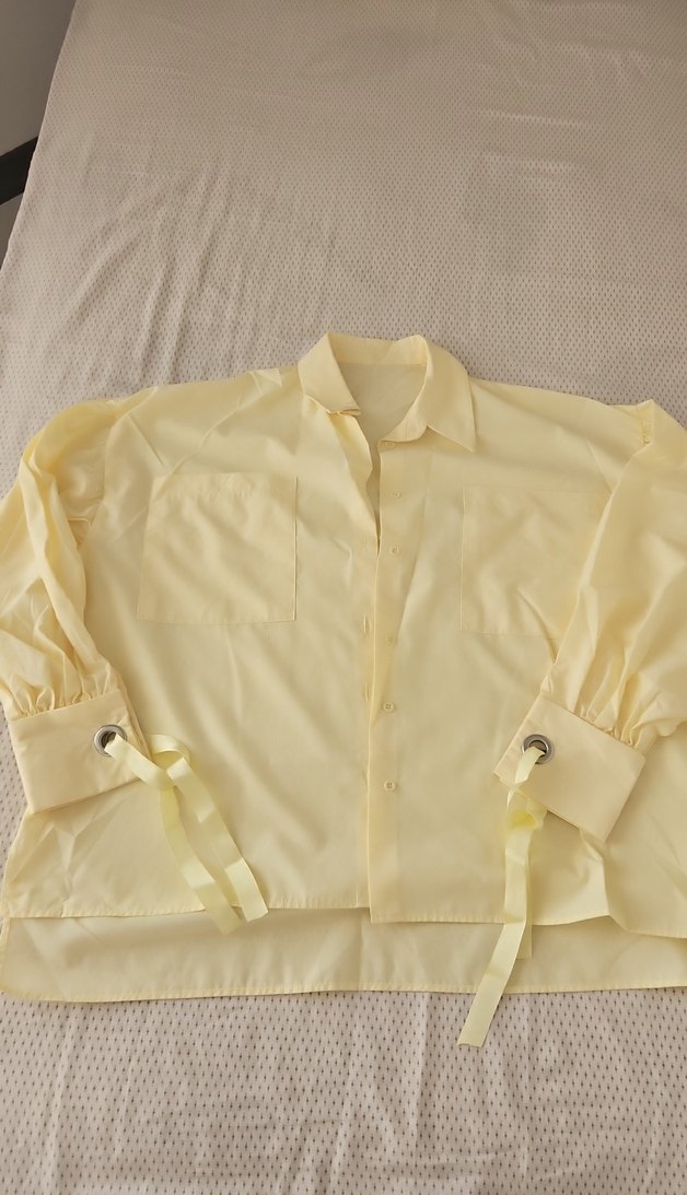 Bu bol kesim kadın gömlek, uzun kollu ve yakalıdır. Pastel sarı, yumuşak ve ipeksi kumaştan, düğmeli ve manşetlerinde kurdele detaylıdır. Sade tasarımı ofis için uygundur.
