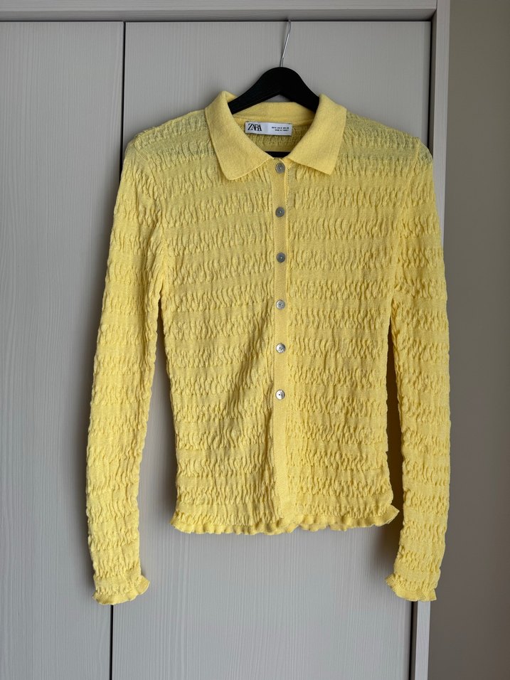Sarı, düğmeli, kadın hırka. Uzun kollu, yakalı ve vücuda oturan normal boyda tasarım. Hiç giyilmedi