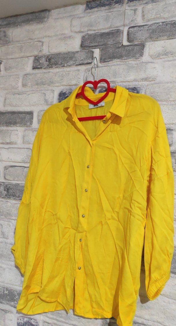 Sarı keten gömlek, düğmeli ön, yakalı ve uzun kolludur. Salaş kesim ve normal midi boyda, günlük rahat kombinlere uygundur.