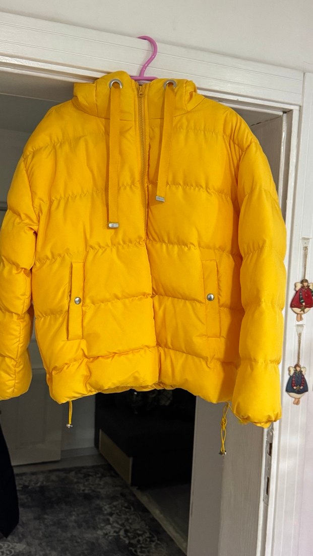 Sarı renkte, düğmeli, yüksek yakalı ve uzun kollu kadın kışlık mont. Orta boy ve vücuda oturan kesimiyle yumuşak, sıcak kumaştan üretilmiştir.