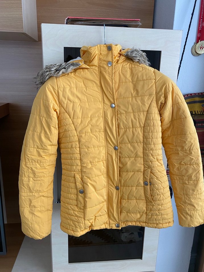 Sarı düğmeli kadın kışlık mont, yumuşak ve sıcak fleece kumaştan yapılmıştır. Uzun kollu, normal kesim ve çıtçıtlı ön kısmı ile dış mekan kullanımı için uygundur. Parlak görünümüyle trend sokak stili için idealdir. ❄️