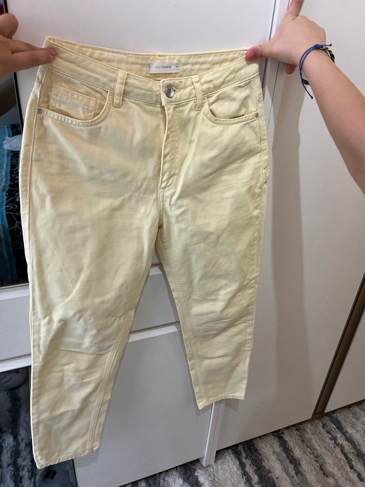 Pamuklu kumaştan, düğmeli, sarı renkli, bol kesim midi kadın jean. Günlük ve sokak stiline uygun.