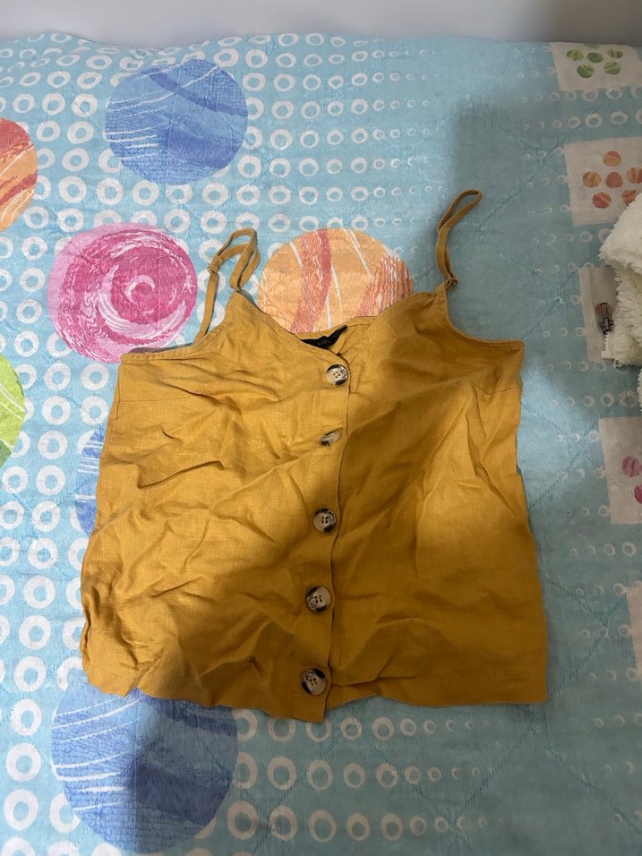 Sarı Düğmeli Keten Askılı Kadın Crop