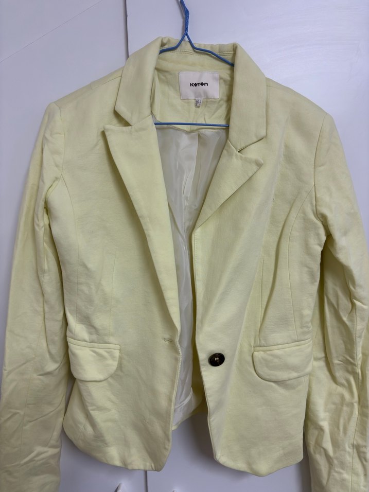Sarı keten kumaştan yapılmış, düğmeli, normal uzunlukta ve regular fit kadın blazer. Uzun kollu, yakalı ve iş ortamına uygun şık bir model.